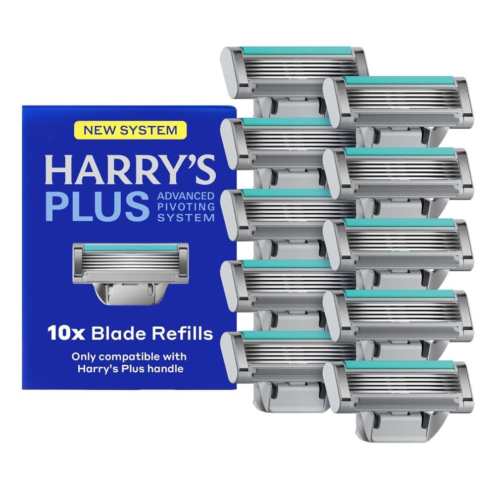 Ten years in the making, the new Harry's Plus shaving system is designed for Harry's smoothest, easiest, comfortablest shave yet. Our all-new Advanced Pivoting System more easily adapts to the curves of your face for a more comfortable shave* (*vs Harry's Original razor). The compact cartridge design provides exceptional precision and versatility, while refined 5-blade technology delivers a close, smooth shave. Each German-engineered razor cartridge includes a lubricating strip with aloe for added comfort and a precision trimmer to tackle sideburns and hard-to-reach spots. This men's shaving kit includes ten razor blade cartridges. Harry's Plus blades are only compatible with Harry's Plus handles.